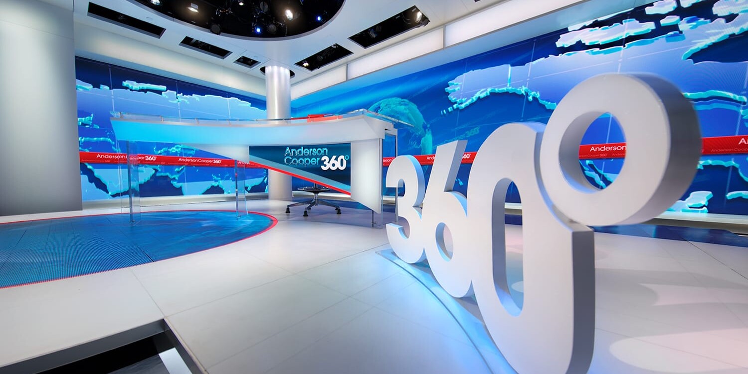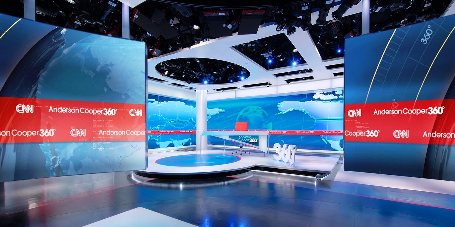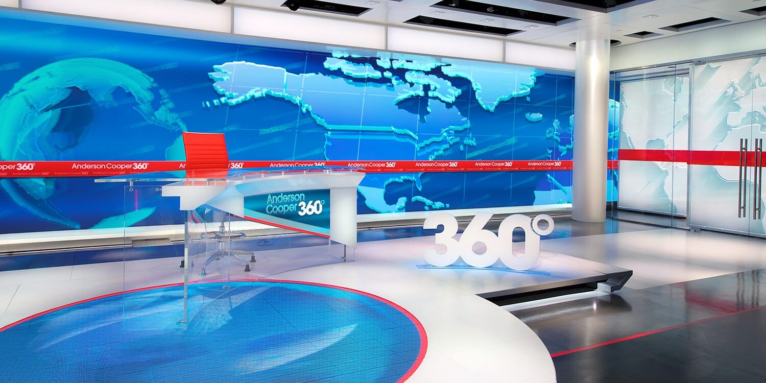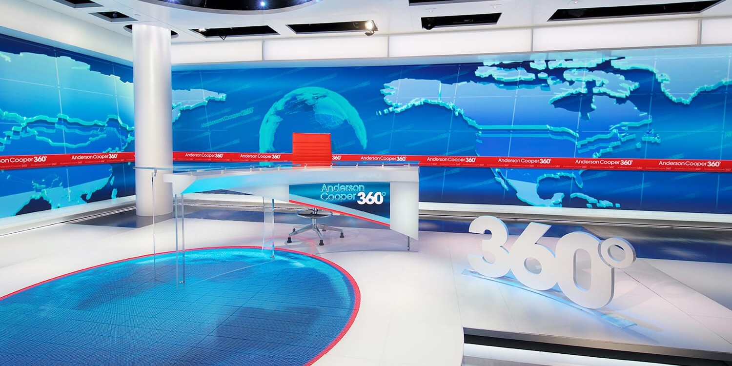 Cooper sits at a gently curved anchor desk in front of video walls where his logo rotates in a toned down bright blue. Cooper’s position at the desk moves depending on how many guests are in the segment. If there are multiple in-studio guests, another desk is seamlessly added to the curved desk. A classic CNN red band is painted across the floor which is accented with pools of light. The red band is mirrored in the LED wall behind Cooper and the cutout edge of the desk. In the corner of the set a clean white circular column pokes through a cut out ceiling element. The ceiling posed all kinds of challenges for lighting who had to negotiate for space to place critical fixtures in the already saturated grid. The clean studio design puts the focus directly on the host with its meticulous lighting. Lighting Anderson Cooper was the first and foremost important task. His features, including his sterling blue eyes, require careful placement and focus to reduce erroneous shadows and carefully balance his face in all variations of his desk. Many thanks to all of the people whose hard work crafted this elegant studio with its specific lighting.