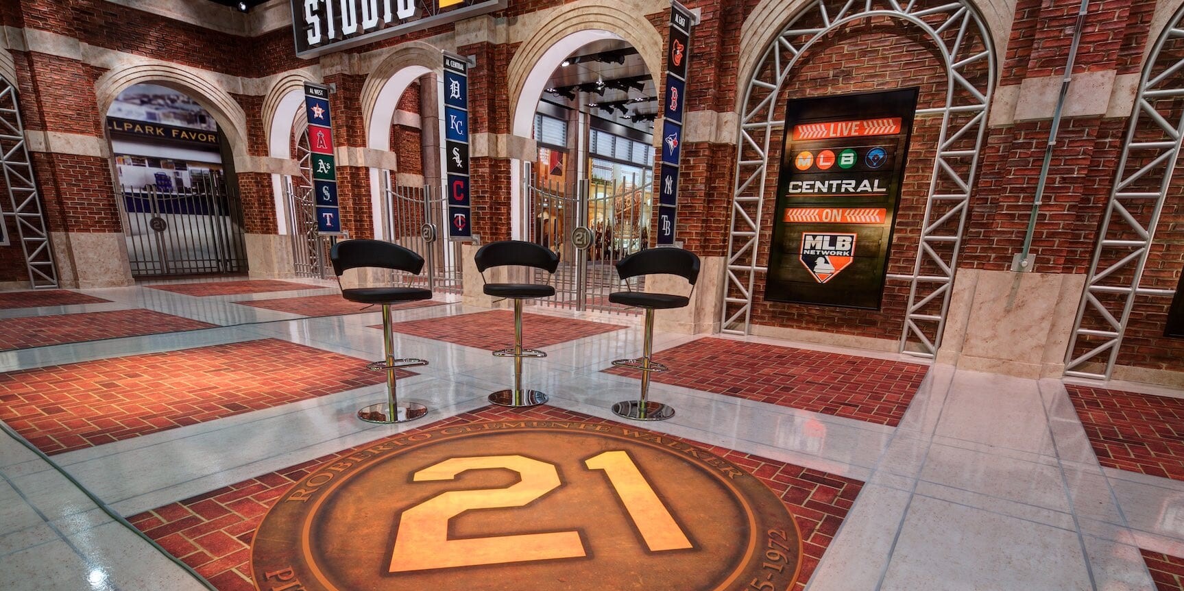 Named in honor of Hall of Famer and humanitarian Roberto Clemente, Studio 21 is home to three daily shows, including “MLB Central,” “MLB Now” and “Quick Pitch.” The space innovates the way MLB Network studio programming is presented, using at least five multi-camera studio positions and cutting-edge technology adaptable to any show, story or club, from hanging video displays to augmented reality graphic components.