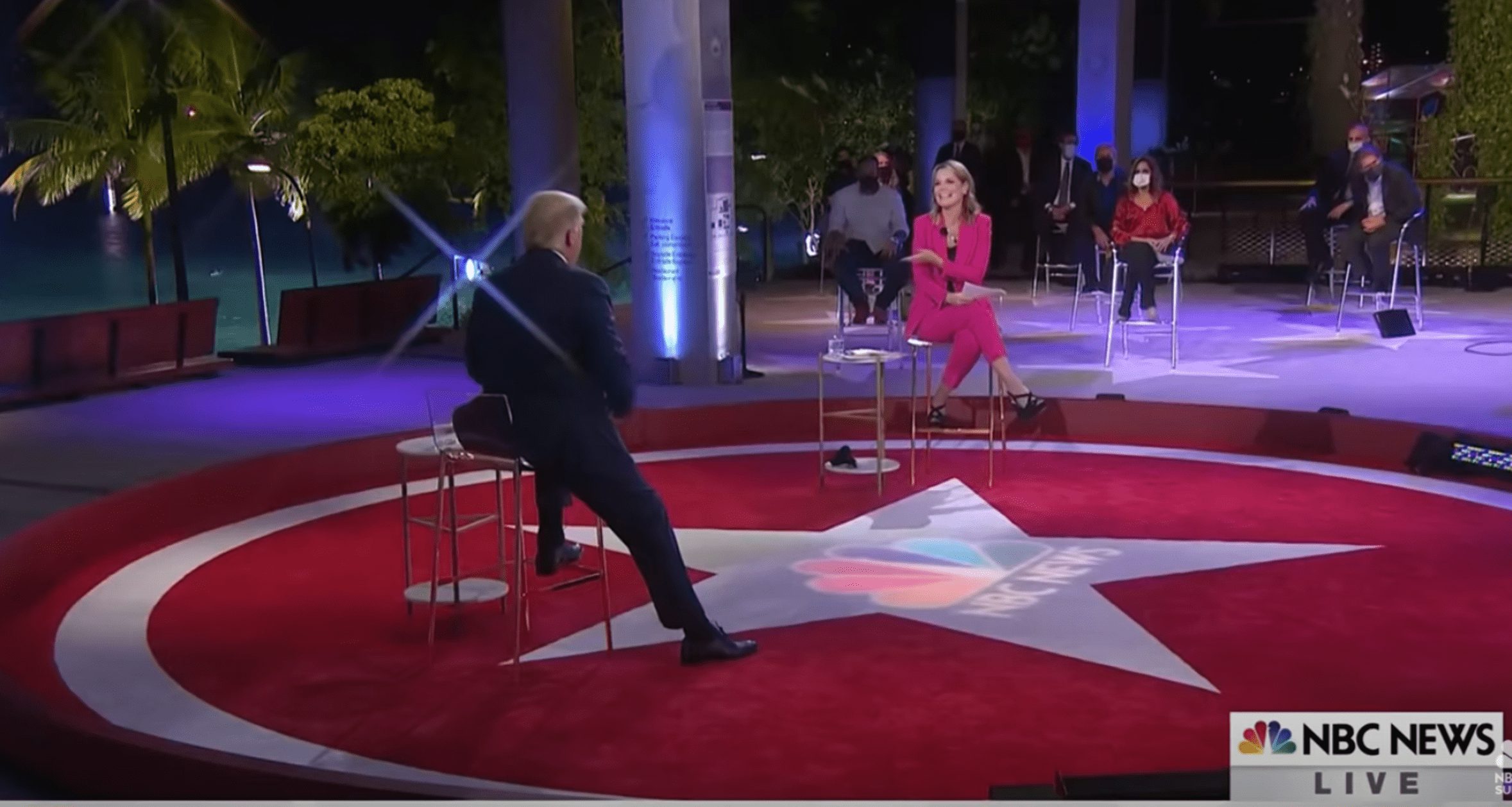 NBC hosted a socially distanced Town Hall for presidential candidate Donald Trump in Miami, Florida on October 15, 2020. Senior Designer Niel Galen led the design team, which included Lighting Designer Dan Rousseau, Gaffer Eric Kasprisin, and Best Boy Sean Linehan. LDG’s lighting design illuminated the east patio of the Perez Art Museum Miami with scenic Miami Bay and MacArthur Causeway serving as a soft backdrop. The stunning outdoor patio with its asymmetrical concrete pillars was accented with decorative hanging planters creating a handsome stage on which to focus on President Trump and Savanah Guthrie.