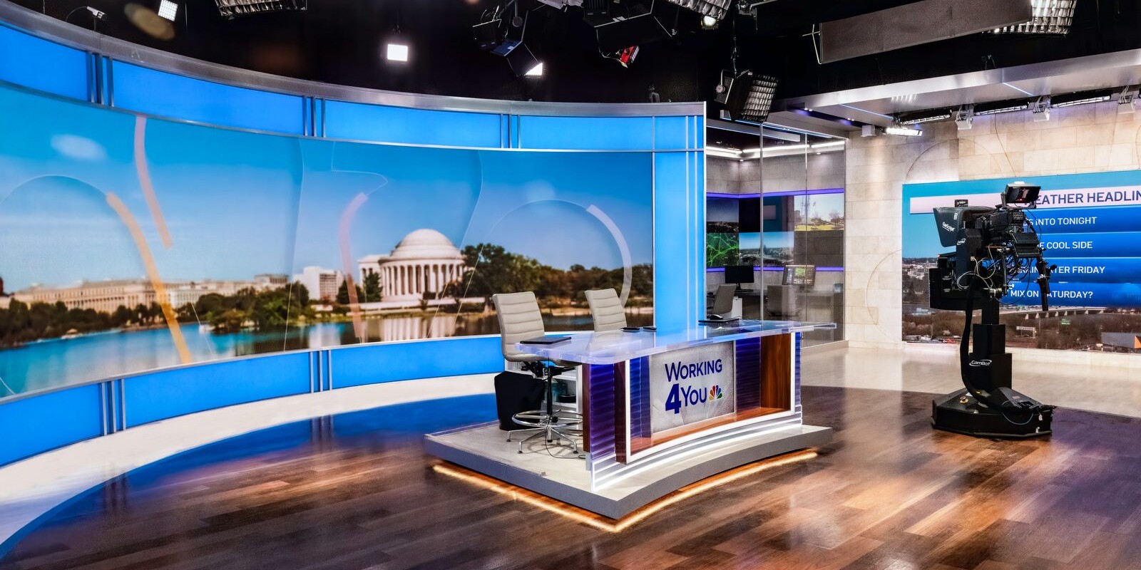 WRC, NBC’s Washington DC local news station & their Telemundo sister-station, WZDC, debuted their new Nebraska Avenue studios in March of 2022. Originally built in 1958, the Nebraska Avenue facility is full of history & tradition, was once home to the NBC News Washington Bureau, famed journalists such as Tim Russert & David Brinkley, and hosted the pivotal Kennedy-Nixon debates. This renovation brings the local stations to the forefront with state of the art technology & a flexible yet nuanced design evocative of the locale & rich history.